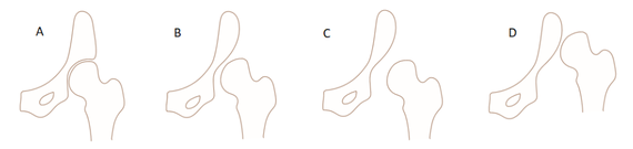 Bij afbeelding A zie je een normale heup. Op plaatje B, C en D zie je vormen van heupdysplasie.